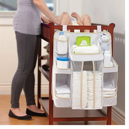 Gray Oxford Baby Bedside Hanging Organizer – Diaper & Toy Storage Bag with Adjustable Height