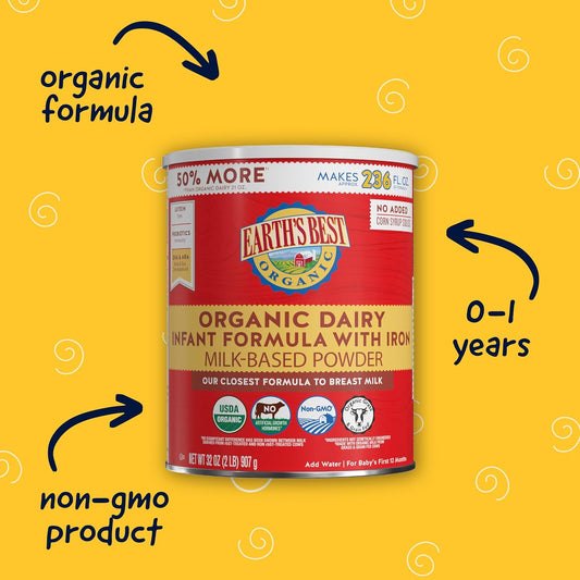 Earth's Best Organic Dairy Infant Formula – Nutrient-Rich Powder with Iron, DHA & ARA (32 Oz, 0-12 Months)